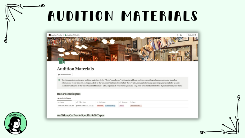 - A place to collect and organize your audition materials, from self-tapes to sheet music to website links.